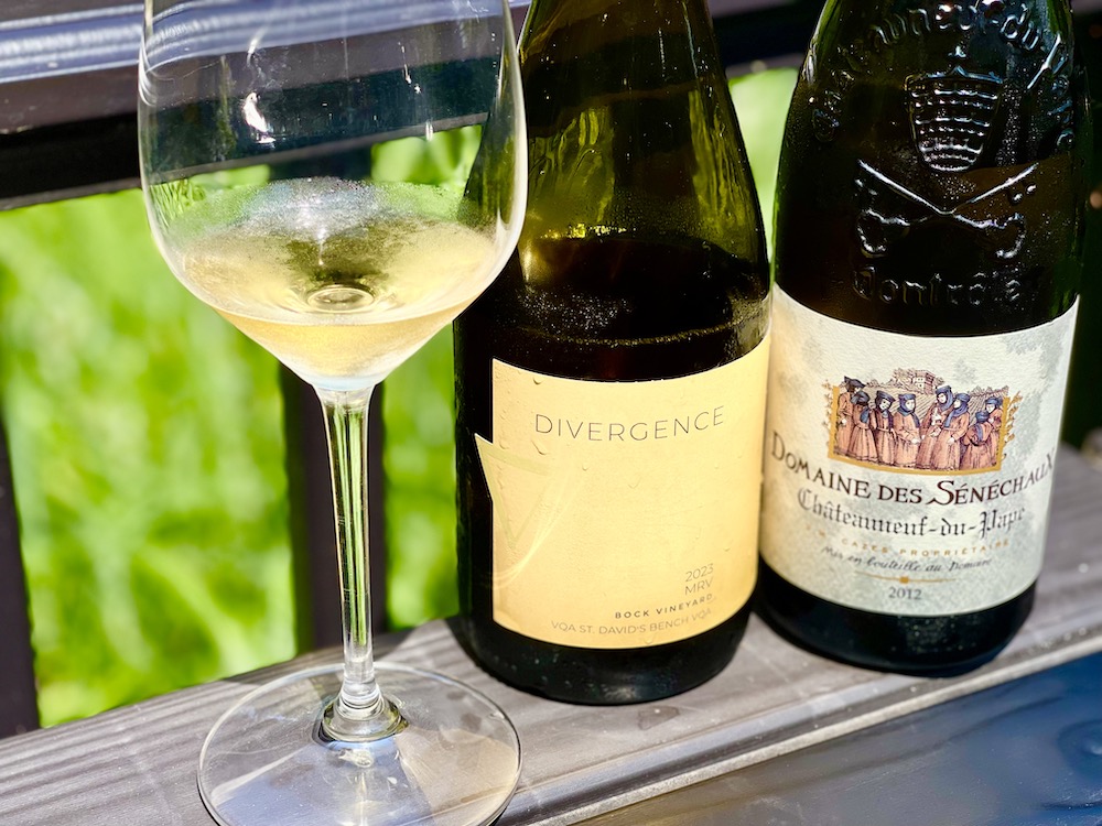 Divergence Wines MRV 2023 ($33, 94 points, retasted beside a Rhone Chateauneuf-du-Pape, 94 points) — Roussanne makes up 32% of this Rhone variety blend with rest consisting of 39% Marsanne and 29% Viognier from the Bock Vineyard. It is Niagara’s first Roussanne blend that is officially VQA approved. Wines in Niagara reviewed this wine previously but wanted to see if there are any similarities to the white blends from the Rhone. I pulled out a 2012 Domaine des Sénéchaux Blanc, a blend of 33% Roussanne, 29.5% Clairette, 29.5% Grenache Blanc and 8% Bourboulenc. Not exactly the same, but the percentage of Roussanne is close in both bottlings and there was a nice similarity between the two wines despite the 10-year age gap. For Jeff Moote’s Rhone blend, the Viognier was pressed separately, while Marsanne and Roussanne were pressed together on top of the Viognier skins. It was all whole cluster pressed, juice was settled and racked to barrel for fermentation and aging for 10 months (no new oak) before blending and bottling. This a more traditional three-variety Rhone blend that is just gorgeous, exciting even, with a generous, rich nose of apricots, guava, orange zest, saline minerality in spades, wild herbs, marzipan, lemon curd, and a touch of vanilla spice. It has a creamy texture on the palate with succulent tropical fruits, apricot tart, lemon squares, orange peel, cantaloupe, wild honey, saline freshness and a rounded, luxurious finish with mouth-watering acidity.